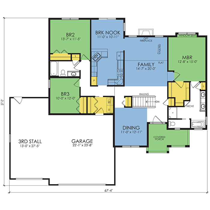 A part of our Wausau Originals, the Bayfield floor plan features 3 bedrooms and 2 bathrooms with a foot print of 67'4''x57 feet and 1841 total square feet of living space. Floor Plan #WO406