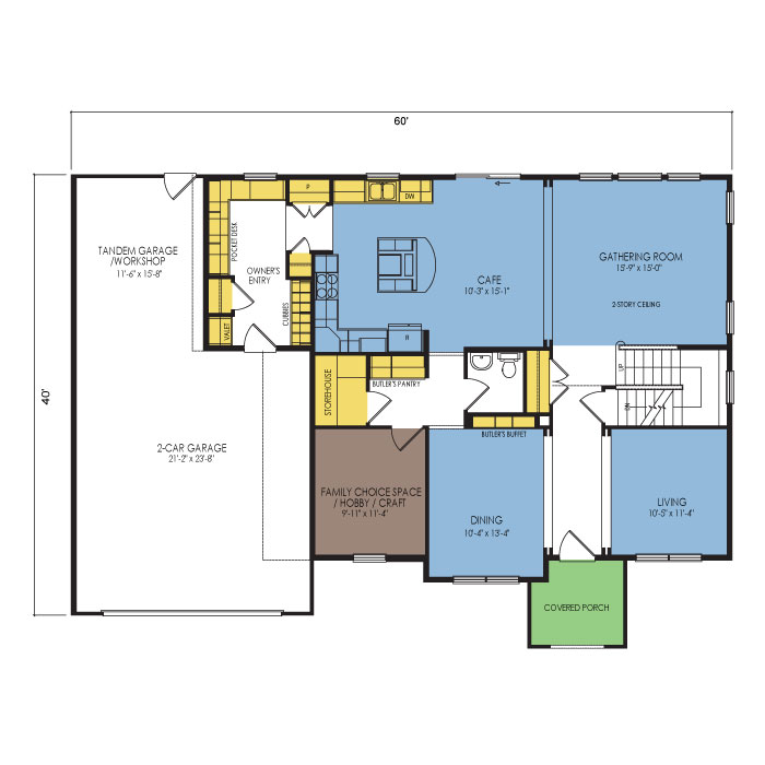 A part of our dream series, the tamarack floor plan features 3 bedrooms and 1.5 bathrooms with a foot print of 44x30 feet and 1342 total square feet of living space.
