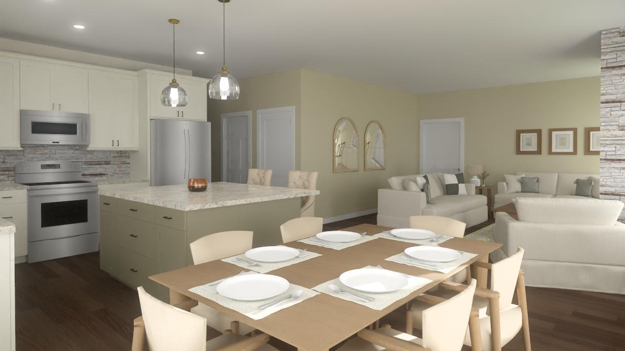 The heart of the home is the open-concept kitchen and dining area, complete with a large island that offers seating, extra storage, and plenty of prep space. A sliding glass door leads to the back deck, creating an easy flow for indoor-outdoor living and entertaining.