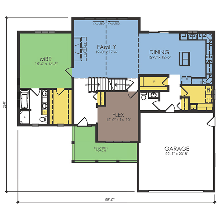 A part of our Wausau Originals, the Iron River floor plan features 3 bedrooms and 2.5 bathrooms with a foot print of 58x52 feet and 2465 total square feet of living space. Floor Plan #WO678
