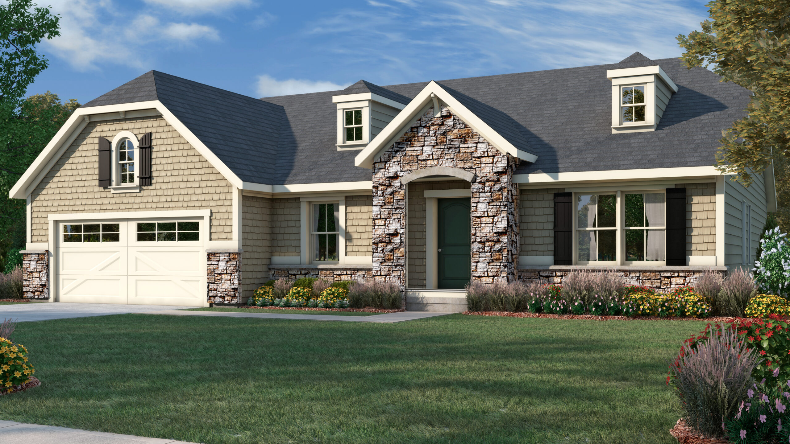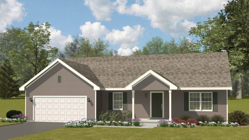 Exterior rendering of Juniper floor plan in Country Exterior Style. 3 bed/2 bath Country