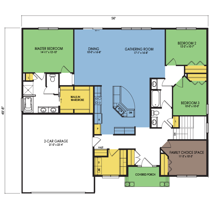 A part of our Dream Series, the Juniper floor plan features 3 bedrooms and 2 bathrooms, a 2 car garage, a footprint of 56x50 feet, and 2060 total square feet of living space. Floor Plan #DR180
