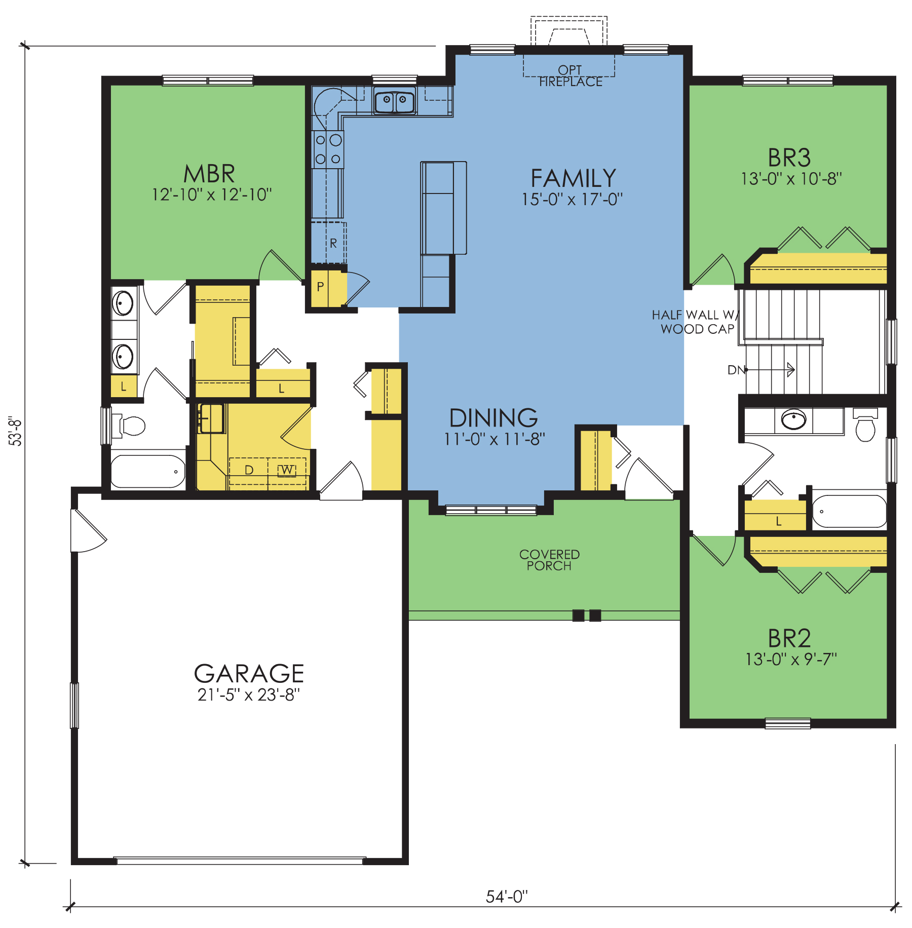 A part of our Wausau Originals, the Nunn Creek floor plan features 3 bedrooms and 2 bathrooms with a foot print of 54x53'8" feet and 1689 total square feet of living space. Floor Plan #WO236